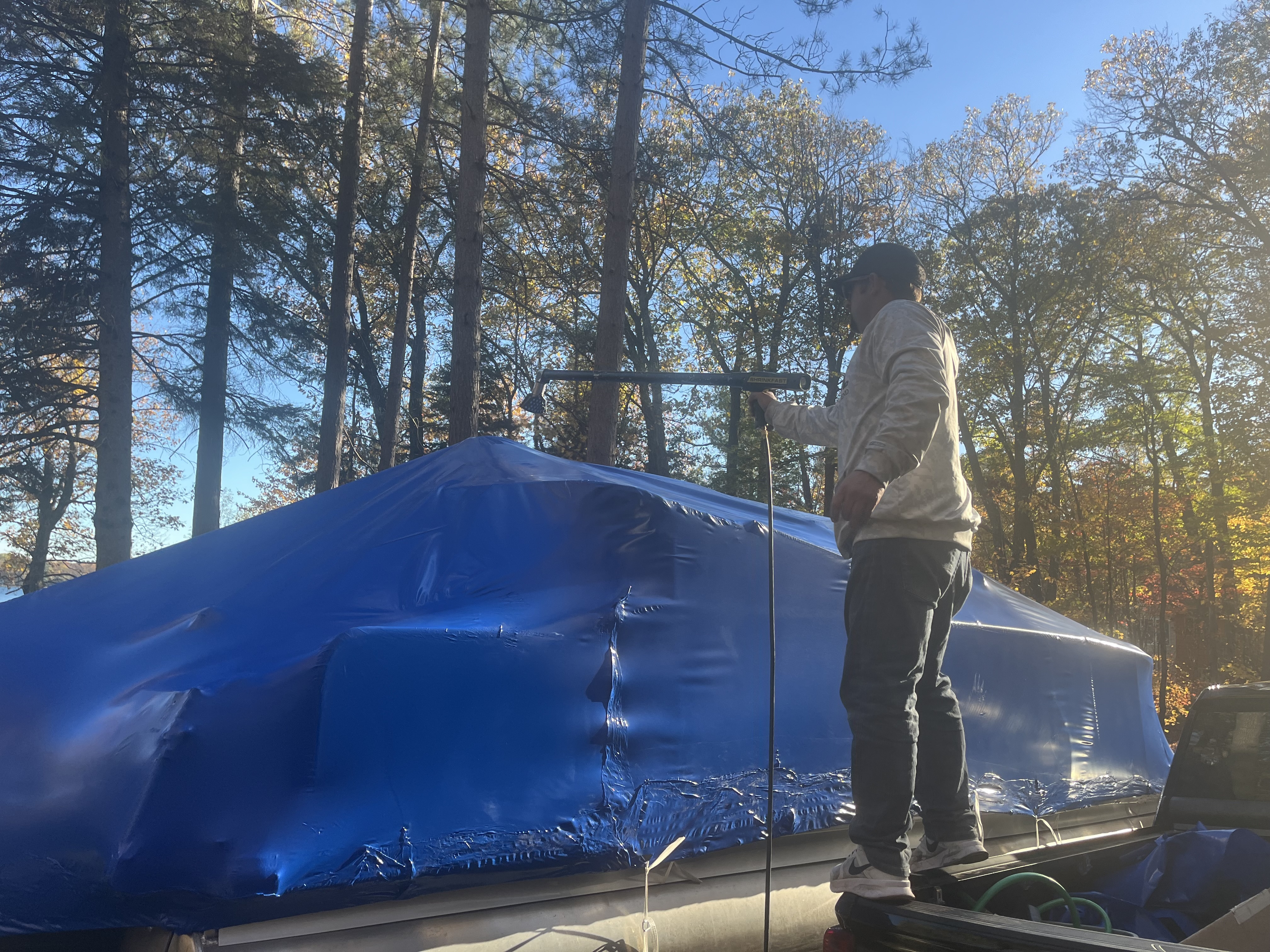 We use a 7 mil. blue or white shrink wrap, made from premium-grade polyethylene with UV inhibitors and other additives. This formulation is designed to resist degradation from sunlight, rain, chemicals, and heat, ensuring your boat remains protected against the elements.
